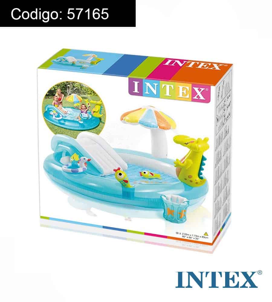 Incluye 1 tobogán con alfombra acolchada, 1 cocodrilo, 1 sombrilla con forma de seta, 1 cubo de pescar hinchable y 1 mini flotador de pato