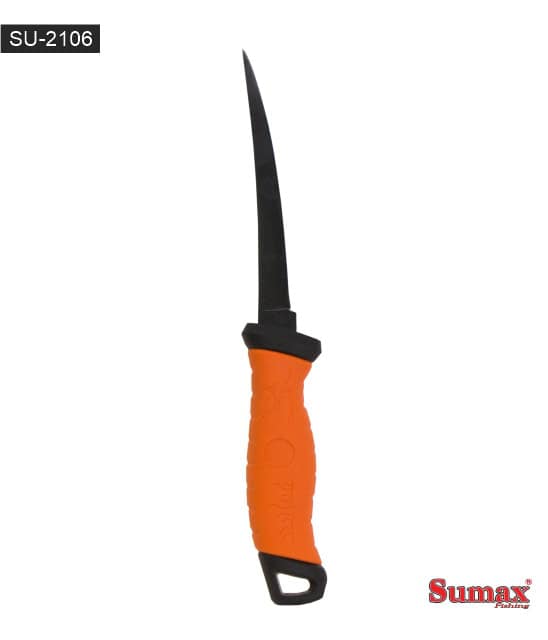 Cuchillo para filetear, hoja en acero inoxidable de alta calidad recubierta de teflón, su vástago se extiende hasta el mango para mayor resistencia y durabilidad. Mango ergonómico, viene con cubierta de nylon para protección.