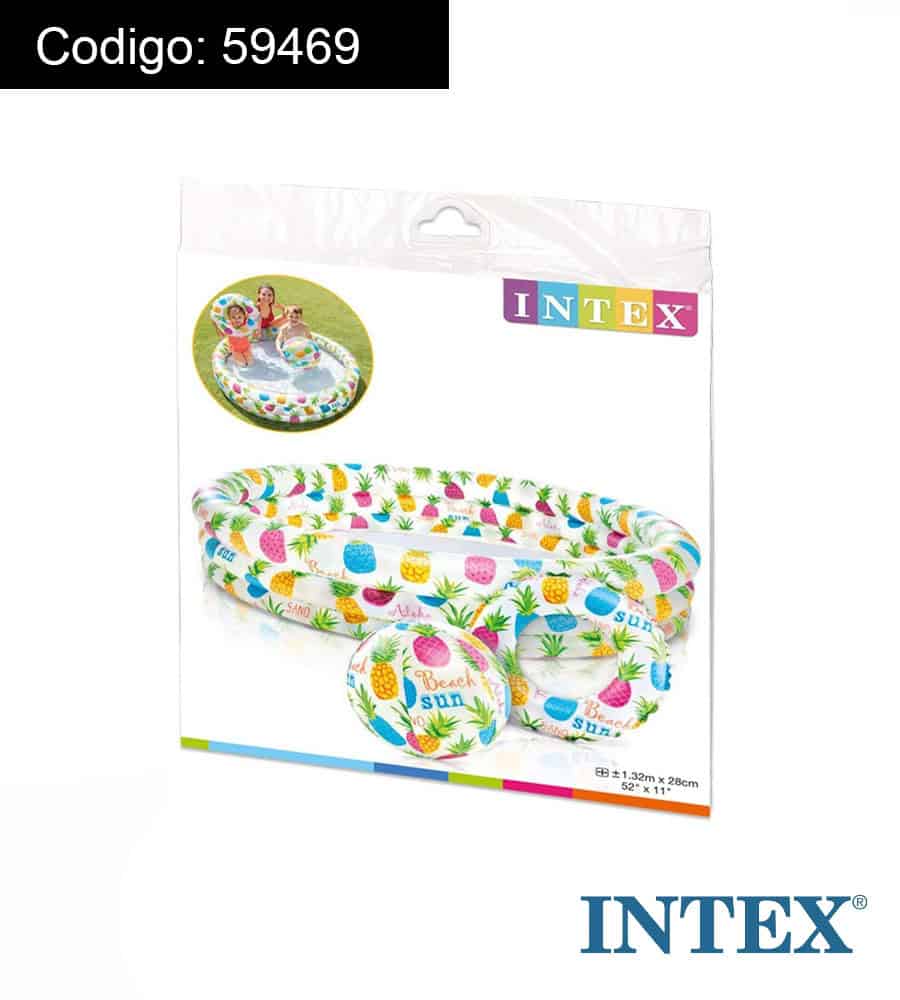 - Piscina hinchable para niños, medidas Ø132×28 cm, flotador y pelota hinchables, medidas 51 cm, con estampado de piñas de colores Resistente: piscina redonda con 3 aros, fabricada con vinilo resistente.
